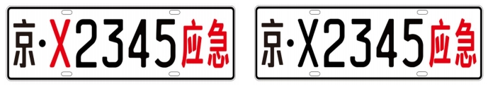 (一)汽车号牌。字符共8位,依次为省(自治区、直辖市)汉字简称、所属救援队伍代号、四位序号和汉字“应急”组成。其中,所属救援队伍代号用X代表消防救援、S代表森林消防。应急部的专用号牌不用英文字母,以与地方的专用号牌区别,如“京·12345应急”表示车辆归属应急部,“京·X2345应急”表示车辆归属北京市应急管理部门。