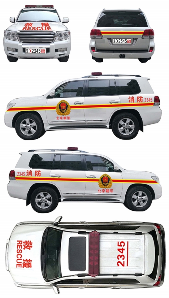 专用号牌分为汽车号牌和摩托车号牌两种。汽车号牌每副两只,分别悬挂在车辆前后部;摩托车号牌为单只,悬挂在车辆后部。专用号牌为白底黑字,配以红色汉字“应急”,其中:汽车号牌字符共8位,依次为省(自治区、直辖市)汉字简称、所属救援队伍代号、四位序号和汉字“应急”;摩托车号牌字符共7位,依次为汉字“应急”、省(自治区、直辖市)汉字简称、三位序号和所属救援队伍代号。悬挂专用号牌车辆外观参照国际通行做法进行标识涂装,车身前面涂装“救援RESCUE”字样,车身侧面涂装国家综合性消防救援队伍徽标、“消防”字样和所属单位名称、车辆编号,车顶涂装车辆编号,车身两侧及车辆尾部涂装装饰条。