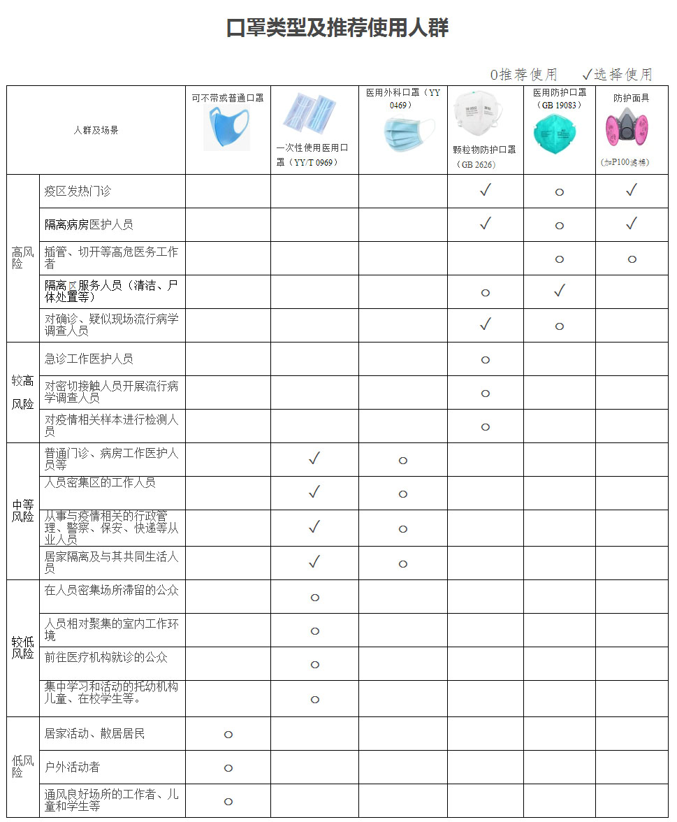 在新型冠状病毒感染的肺炎流行期间,建议选择合适的口罩类型,不过度防护。按防疫工作性质和风险等级提出以下指引: