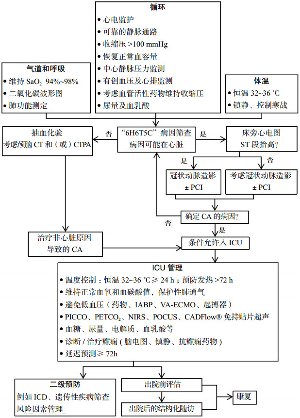 PCAS治疗重点在于逆转PCAS的病理生理表现,全程集束化管理。怀疑CA的原因为心源性,且心电图提示ST段抬高,在排除禁忌证后应紧急行冠状动脉造影。去甲肾上腺素为CA后患者的一线血管收缩剂,药物治疗后仍持续休克,可考虑体外机械循环支持。CPR后治疗中PaCO2需要维持在一个正常的生理范围,考虑温度校正的情况下使SaO2≥94%。CPR后治疗中应积极评估中枢神经系统损伤程度,并采用减轻神经功能损伤的联合保护措施。