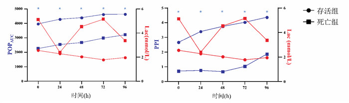 2.4 存活组与死亡组组间临床参数变化比较POPAUC、PPI(0 h、24 h、48 h))、APACHE Ⅱ、SOFA在两组间差异有统计学意义(P<0.05),见表 4,图 2。