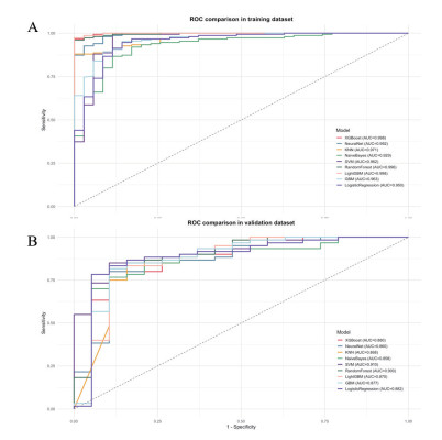| 图 1 不同模型在训练集、验证集上的ROC曲线比较 Fig 1 ROC curves of different models on the training set and validation set |