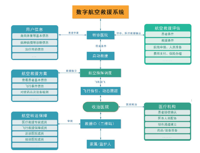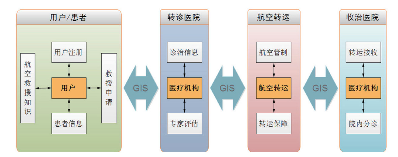 通过注册形成以普通公众为基础的用户群体,可利用航空救援科普模块,了解适用病种、申请流程、救援步骤、保险及费用参考等航空救援基本知识。需启动航空救援时在手机端按下“航空救援申请”键,系统将引导患者完善航空转运申请表,并逐级推送至主治医生、科主任及医院医务科审核。当院方审核通过并选定收治医院和航空公司后,用户可与收治医院及航空转运公司服务人员建立联系,进一步就治疗、合同、保险、缴费等其他事项进行对接交流。