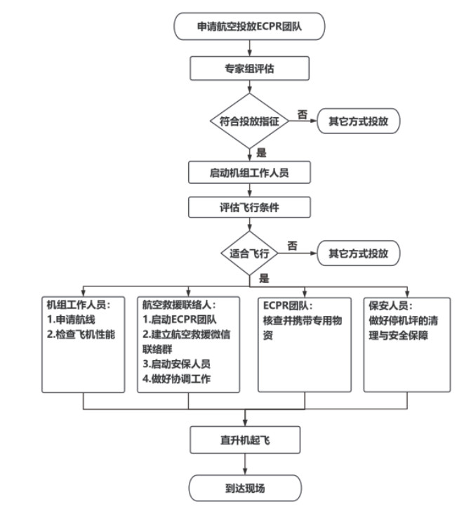 县医院医生认为CA患者为目标人群,且患方同意行ECPR及HEMS的,立即电话联系本院急诊航空专用电话(2781120),急诊科利用紫云信息系统一键启动航空救援专家及仪器投放流程,见图 1。ECPR团队到达现场后,立即行ECPR。建立ECMO支持后再由救护车将患者转运至本院,进一步完善复苏后治疗。