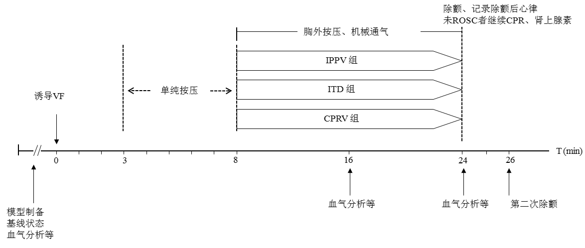 1.3 研究方案动物模型制备完成后进行动静脉血血气分析, 确证通气和氧合基线状态。稳定30 min后, 通过左侧颈外静脉鞘管置入诱颤电极至右心室, 诱颤工装以24 V/50 Hz交流电放电约0.5 s, 以监护仪出现典型VF波形、动脉血压波形及脉搏指氧波形消失来确定诱颤成功。立即断开呼吸机, 停止输液和镇静药物泵入。经过3 min无处理VF后, 使用心肺复苏机(WISH-SL-FS-A型, 三龙科技公司, 武汉)进行持续胸外按压, 按压频率104次/min, 深度为猪胸廓前后径的30%。进行5 min单纯胸外按压后, 进入高级生命支持阶段(advanced cardiovascular life support, ACLS), 继续胸外按压并给予机械通气。IPPV组采用容量控制模式: 氧浓度100%, 潮气量7 mL/kg, 呼吸频率10次/min, 恒定吸气流速30 L/min, 呼气末正压为0, 吸呼比1∶2, 气道压力报警上限为60 cmH2O, 关闭触发。ITD组机械通气设置同IPPV组, 并将ITD(ResQPOD ITD 16, 卓尔医疗公司, 美国)连接在气管插管与呼吸机管路间。CPRV组采用CPRV模式, 基本通气设置与IPPV组相同, e-ITD极限设置为-20 cmH2O。