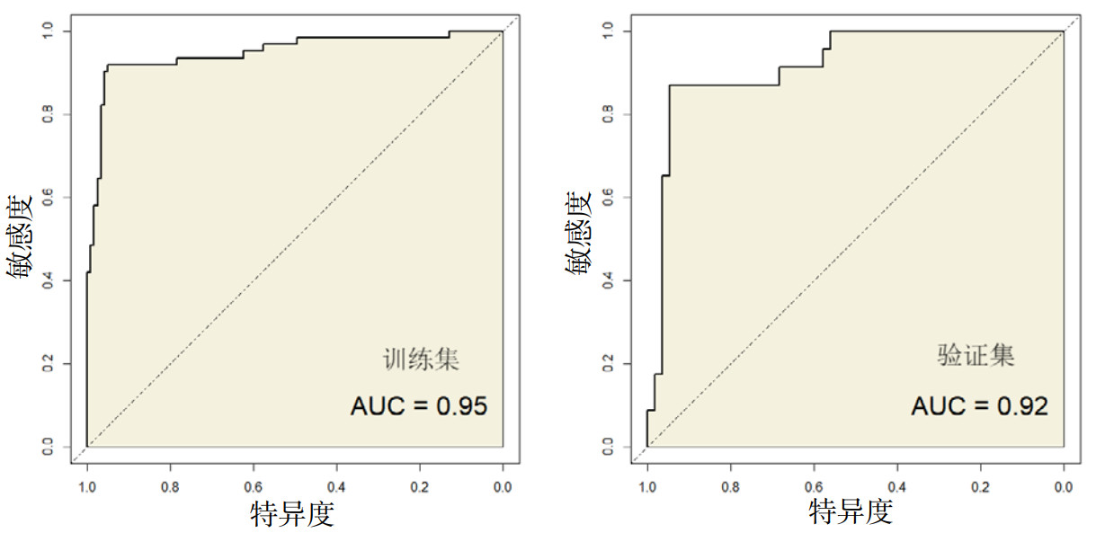 | 图 2 列线图预测模型在训练集和验证集中的ROC曲线 Fig 2 ROC curve of nomogram prediction model in training set and validation set |