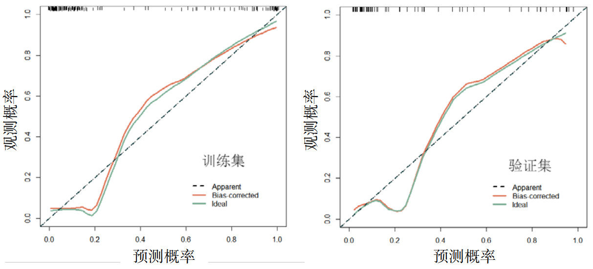 | 图 3 列线图预测模型在训练集和验证集中的校准曲线 Fig 3 Calibration curves of nomogram prediction model in training set and validation set |
