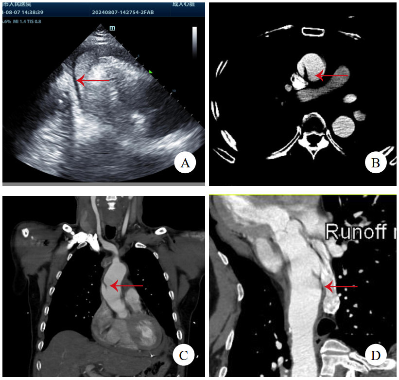| 注:A为平扫CT,箭头示升主动脉壁增厚、密度增高;B为TEE舒张期,箭头示飘动纤细光带;C为TEE收缩期,箭头示飘动纤细光带;D为主动脉CTA,曲面重建,箭头示内膜片 图 1 例1患者两次CT及术前TEE影像 |