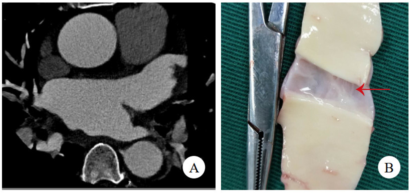 病例4,男,63岁,因“活动后胸闷、气促6年,加重1月”入院。TTE提示二尖瓣前叶A2区腱索断裂伴脱垂、重度返流,主动脉瓣重度返流,三尖瓣中度返流,左心室显著增大,左心室舒张末期直径86 mm,心功能减低,中重度肺动脉高压,升主动脉内径增宽直径43 mm。冠状动脉CTA提示双侧冠状动脉无显著病变,少量心包积液,未见主动脉根部病变(图 4A)。术前准备后,择期手术,术中见主动脉前壁窦管交界水平一长约2 cm的内膜撕裂符合LIT。仔细观察切除标本(图 4B),见内膜裂口边缘光滑,考虑为陈旧性改变。予行Bentall加二尖瓣机械瓣置换加三尖瓣成型术。术后康复顺利,规律抗凝随访1年。