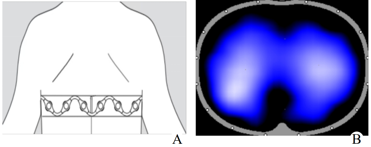 EIT是一种基于电抗变化的非侵入性医学成像技术,其核心原理基于生物组织的导电性差异,推断组织的电导率分布,从而反映组织的生理状态[5]。通过环绕胸部的多电极阵列(通常为16或32电极)施加安全交变电流,检测体表电压变化,利用逆问题算法重建胸腔横断面的阻抗分布图像。肺组织因通气与血流变化引起局部电导率改变,EIT可据此动态捕捉通气不均、肺泡塌陷或过度膨胀等病理状态[6],研究人员可依据获取的数据,借助相关数学算法进行图像重建,进而提供肺部功能与结构的相关信息;经过进一步数据处理,还能实时观察患者肺部的通气及血流情况[7-8]。
