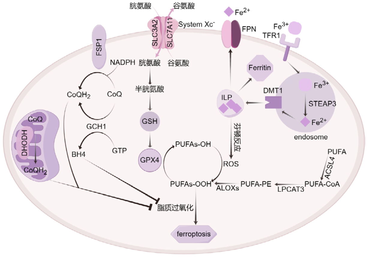 铁是人体中参与血红蛋白合成和氧转运不可缺少的微量元素,机体内铁代谢过程主要包括摄取、储存、利用、排出等,铁稳态对维持机体各项功能十分重要[10]。循环转铁蛋白(transferrin, TF)募集细胞外三价铁(Ferric, Fe3+)并与细胞膜上转铁蛋白受体1(membrane protein transferrin receptor 1, TFR1)特异性结合,将Fe3+以内吞的形式摄取到胞内。金属还原酶即前列腺六跨膜上皮抗原3(six-transmembrane epithelial antigen of prostate 3, STEAP3)可以在内体中将Fe3+还原为二价铁(Ferrous, Fe2+),在这之后,内体顶端的二价金属转运蛋白1(divalent metal ion transporter-1, DMT1)释放Fe2+到胞浆,并储存在不稳定铁池(labileironpool, LIP)中,其余Fe2+以铁蛋白(ferritin)的形式储存或通过铁转运蛋白1(ferroportin-1, FPN)排出细胞。在铁过载的情况下,芬顿反应(Fenton reaction)被激活,产生羟基自由基并促进ROS的产生,从而导致脂质过氧化物的积累并破坏细胞中的氧化还原平衡,促进铁死亡[11]。因此,通过使用铁螯合剂等降低胞浆游离铁的含量或调控铁代谢过程中的相关靶基因,可调节细胞对铁死亡的敏感性从而影响铁死亡。