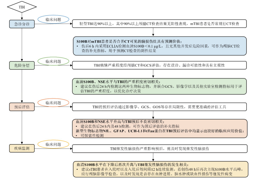 基于目前TBI诊疗过程中的现有临床问题,急性脑损伤生物标志物在TBI中的应用价值和检测建议见图 1