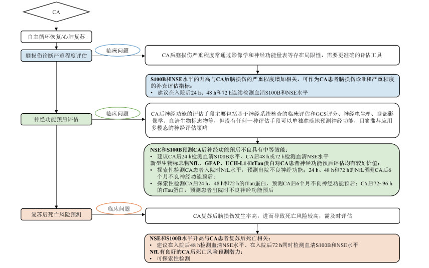 图 2 急性脑损伤生物标志物在CA中的应用价值和检测建议