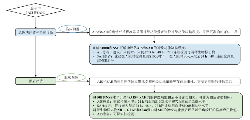 图 3 急性脑损伤生物标志物在急性脑卒中患者中的应用价值和检测建议