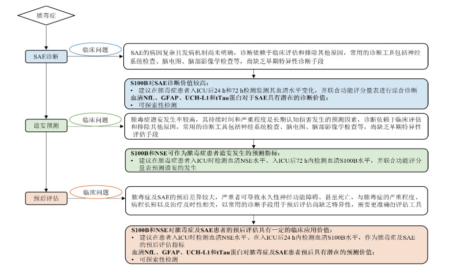 推荐意见15.2:血清NfL、GFAP、UCH-L1和tTau蛋白对脓毒症及SAE患者预后具有潜在的预测价值(证据级别:3;推荐级别:C)。