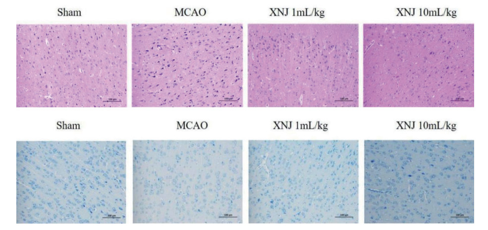 | 图 3 大鼠脑组织HE染色和尼氏染色(200×) Fig 3 HE and Nissl staining of rat brain tissue (200×) |