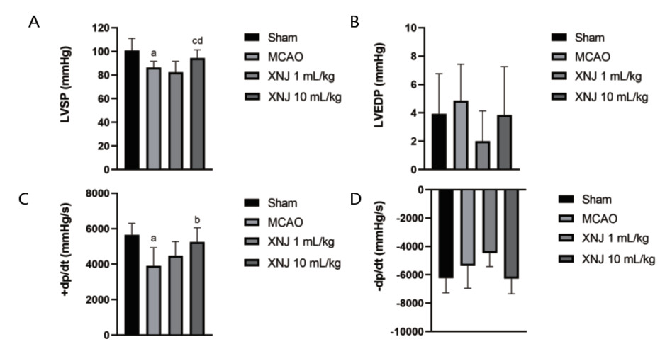 | A:左心室收缩压;B:左心室舒张末压;C:左心室压力最大上升速率;D:左心室压力最大下降速率;vs. Sham,aP < 0.05;vs. MCAO,bP < 0.01;vs. MCAO,cP=0.063;vs. XNJ 1 mL/kg,dP < 0.05 图 4 醒脑静注射液对MCAO大鼠血流动力学的影响 Fig 4 Effect of XNJ Injection on hemodynamics in MCAO rats |