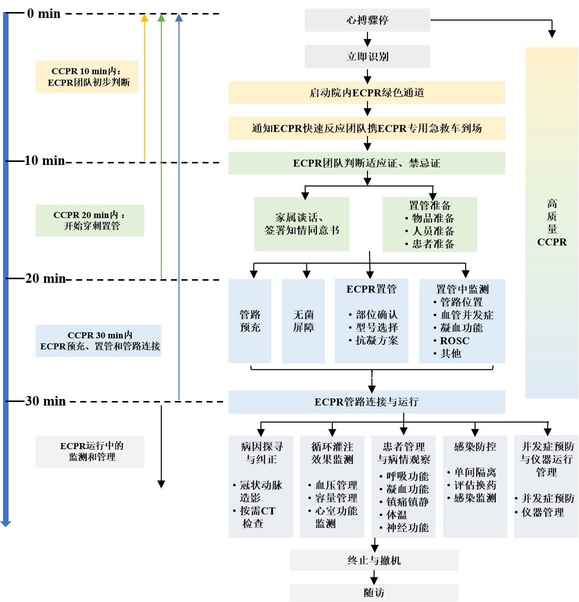 心搏骤停至启动CCPR的时间(无灌注时间)、CCPR持续时间(低灌注时间)、心搏骤停至ECPR启动的时间等指标对ECPR患者的预后有显著影响[13-16]。建立院内ECPR应急预案,通过快速识别与响应、快速通道与优先救治,可最大程度缩短ECPR启动时间、改善患者预后。