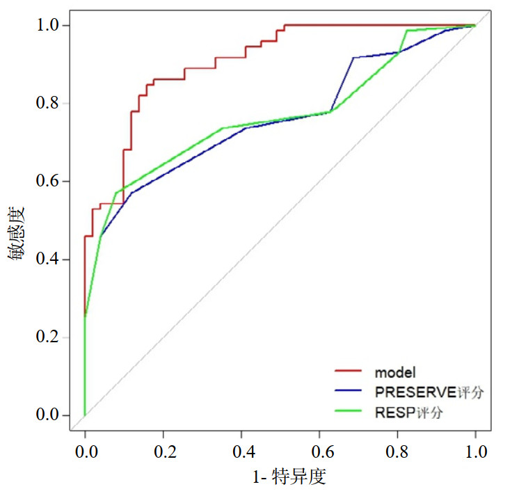 将本研究开发的新模型与RESP评分及PRESERVE评分模型进行预测价值的比较(表 3、图 6),AUC分别为0.906、0.759和0.766,使用Delong检验对三条曲线进行比较,结果显示新模型与另外两种评分AUC相比,差异有统计学意义(Model vs. PRESERVE评分,P=0.001;Model vs. RESP评分,P=0.002),结果显示本研究模型评分判别能力优于上述两种预测评分工具。
