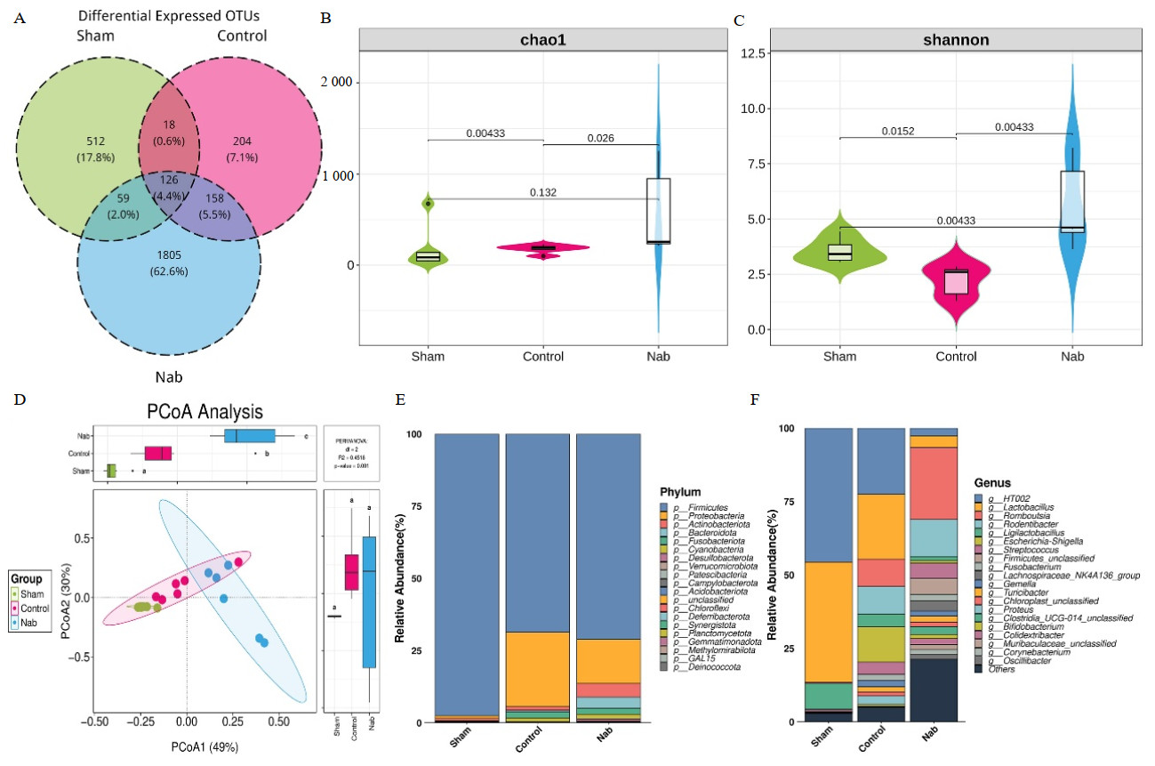 | 注:A为三组大鼠OUTs韦恩图;B为Alpha多样性分析——chao1指数小提琴图;C为Alpha多样性分析——Shannon指数小提琴图;D为Beta多样性分析——基于Weighted_Unifrac距离的PCoA分析图;E为门水平微生物组成的相对丰度柱状堆叠图;F为属水平微生物组成的相对丰度柱状堆叠图;Sham为对照组,Control为单纯心肺复苏组,Nab为丁酸钠组 图 3 各组大鼠回肠菌群分析 Fig 3 Analysis of ileal microbiota of rats from each group |