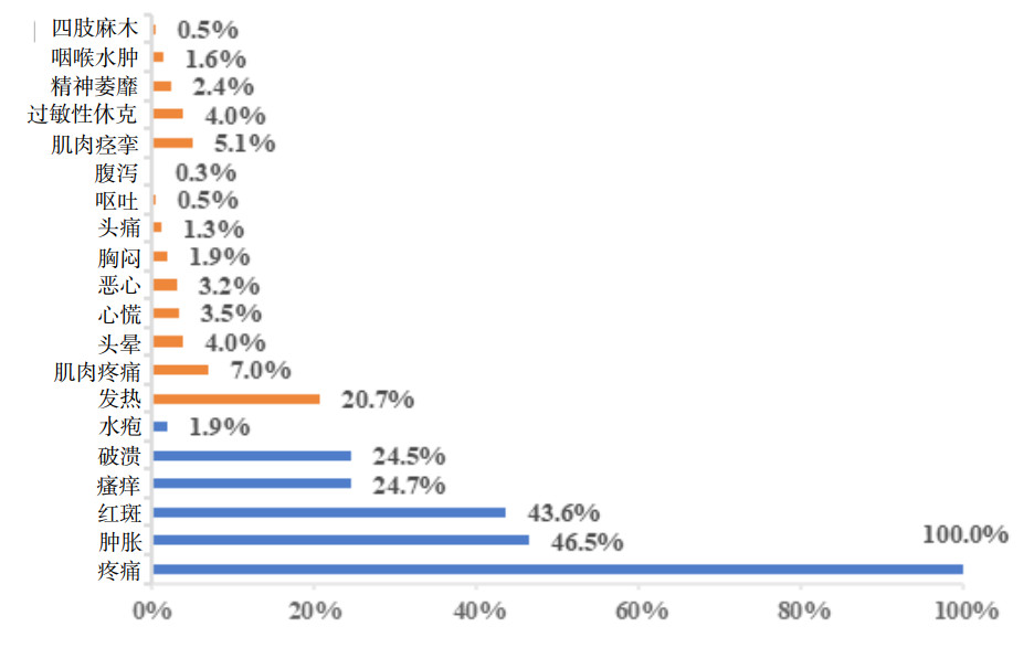 蜇伤严重程度分级[5]:(1)轻型仅有局部皮肤损伤症状;(2)中型有局部皮损和轻微全身过敏反应(头晕、头痛、咳嗽、胸闷、心慌、恶心、呕吐、腹痛、腹泻、发热、肌肉疼痛、局部肌肉痉挛),轻型伤员中出现下列情况的,如过敏体质、年龄 > 65岁且合并高血压、糖尿病、冠心病等基础伤情者可判定为中型;(3)重型有局部皮损和严重全身过敏反应(咽喉水肿、持续高热、肢体严重肿胀、四肢麻木、全身肌肉痉挛、精神萎靡、过敏性休克)。全身过敏反应指蜇伤后数分钟至数小时内出现皮肤黏膜症状和至少1个其他系统受累症状[5]。