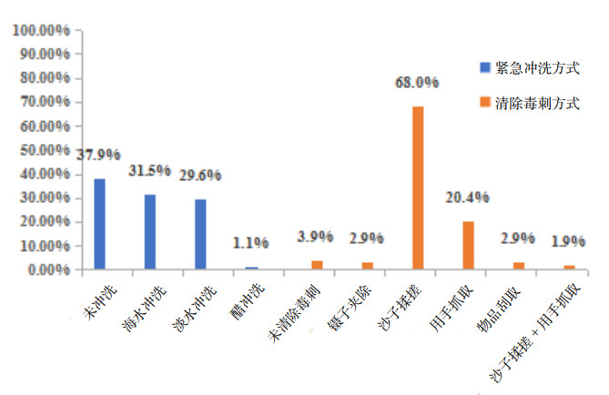 | 注:海水冲洗和镊子夹除为正确处置方式,其他为错误处置方式 图 3 现场处置方式占比 Fig 3 Proportion of on-site management practices |