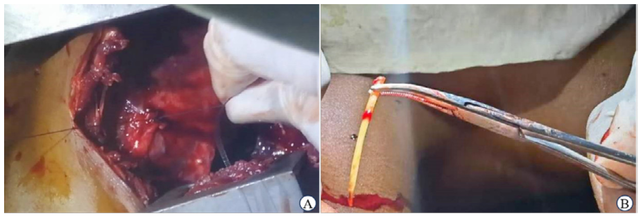 根据患者病史及辅助检查,考虑外伤后左心室异物遗留,左下肺感染、肝硬化伴功能不全、贫血和血小板减低,合并多种传染性疾病和凝血功能异常。入院当天开始给予头孢曲松钠2 g抗感染,1次/d静脉滴注,患者入院后体温正常,本地区无法开展成分输血,治疗5 d后查体睑结膜发白,输新鲜全血400 mL纠正贫血、改善凝血功能,第6天复查血红蛋白111 g/L、血小板74×109/L,在脉搏氧饱和度和袖带血压监测下采用保留自主呼吸非气管插管硬膜外麻醉实施左心室异物取出术,左侧第5肋间开胸,探查见左侧胸腔少量淡黄色积液,左肺上叶下舌段和下叶基底段肺组织与心包黏连,膈肌侧叶间裂可见一鸡蛋大小的椭圆形囊性包块,打开后约50 mL白色稀薄脓液流出,异味不明显,彻底清除囊壁,钝性分离黏连,近心尖处左心室前壁心包与心脏紧密黏连,局部明显增厚,使用手术刀片轻刮后触及明显硬质异物,使用2-0 Nylon线以异物为中心,直径约1.5 cm带黏连的心包缝圆形荷包,深度到心室肌层,使用中弯钳夹紧异物并拔出,收紧荷包线打结(图 2A)。异物为仙人掌刺,中间段直径约2 mm,长约4 cm(图 2B);剥脱并切除部分与左心室前壁黏连的心包,检查无活动性出血后使用碘伏盐水冲洗胸腔后于腋中线第7肋间放置胸腔引流管,关胸术毕。术中患者轻碰后出现右侧鼻孔出血,纱布填塞止血。手术时长1 h,患者术后继续使用头孢曲松抗感染治疗,用法同术前。术后24 h引流淡血性液体450 mL,输新鲜全血400 mL;术后第7天拔除引流管,双肺呼吸音清,术后无发热,四肢活动无异常,停药观察,术后第11天出院,生命体征平稳,无不适主诉,嘱出院后戒酒、低盐饮食、当地疾控部门复查传染病。出院后2个月和6个月门诊复查恢复良好,复检确诊人体免疫缺陷病毒和乙型肝炎病毒感染,未行特殊治疗,血压正常范围。