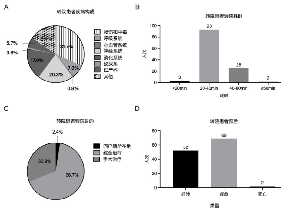 | 注:图A为转院患者的疾病类型构成;B为转院耗时分布;C为转院目的构成;D为转院患者的预后 图 3 2023年普陀山123例转院患者的特征与转归 |
