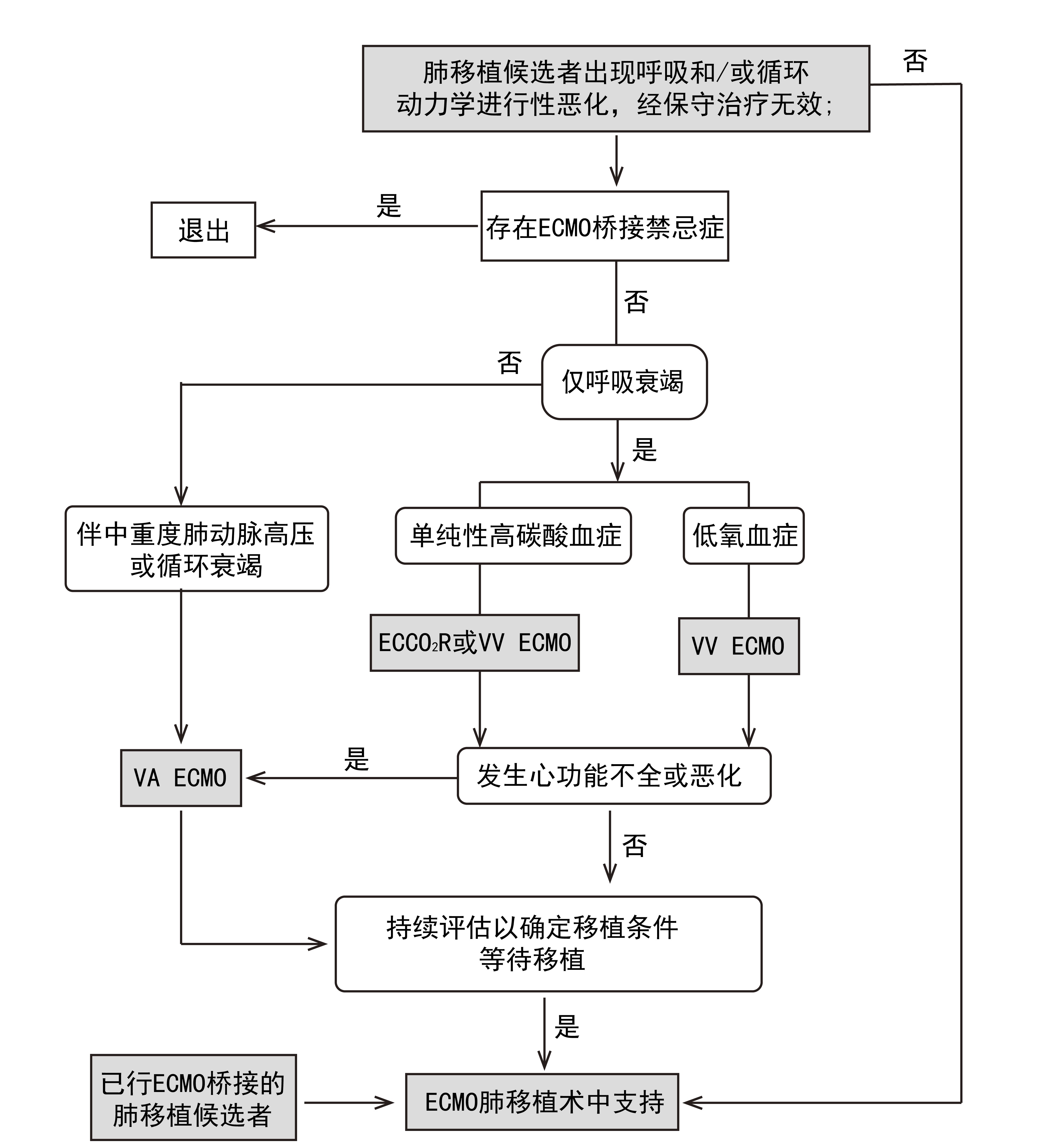 推荐意见2:在肺移植评估过程中或已纳入等待名单的患者,出现呼吸和(或)血流动力学恶化,经常规治疗无效时,如无新发肺移植及ECMO禁忌证,建议使用ECMO桥接。(推荐强度:B证据等级:2a)