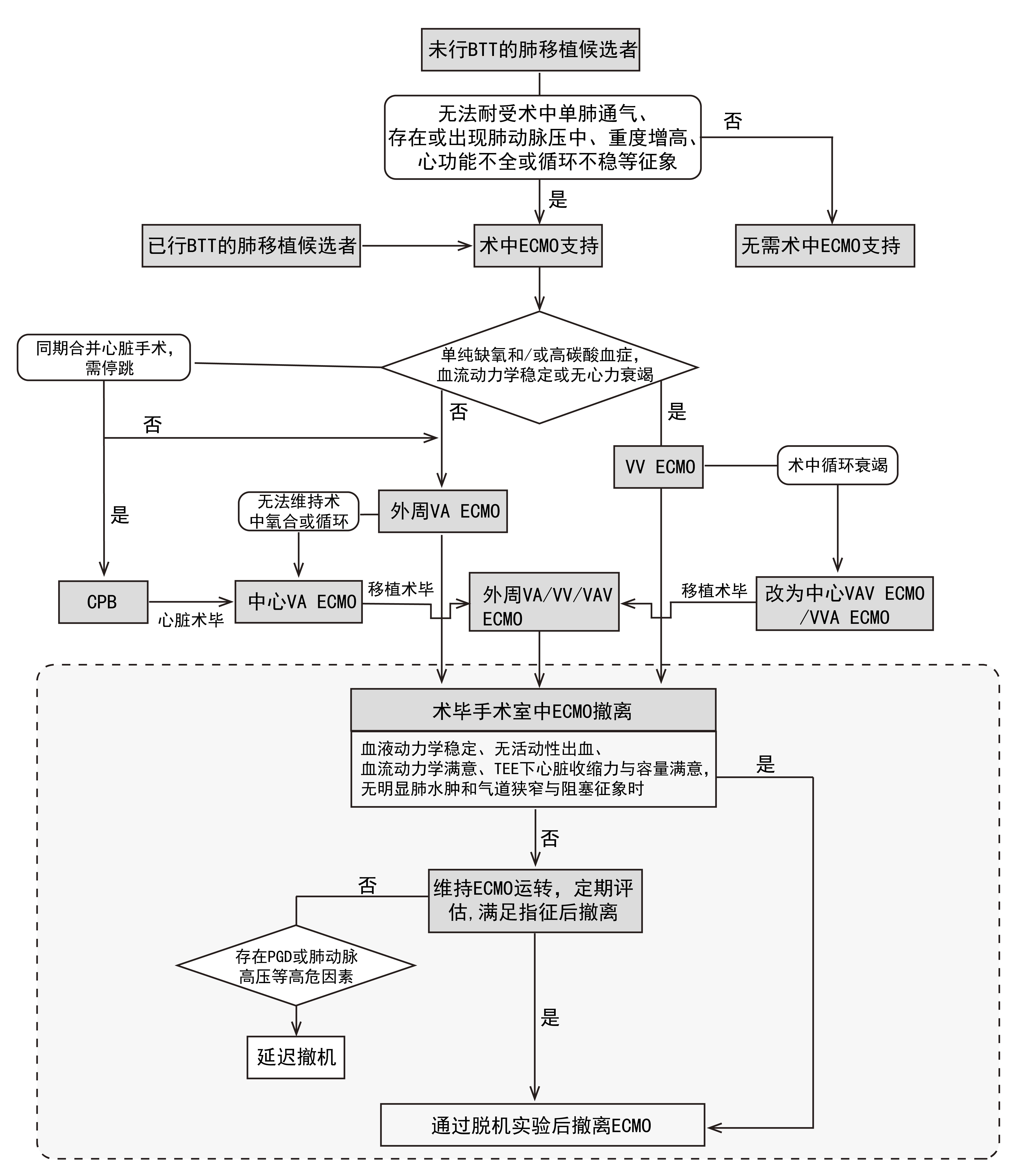 推荐意见12:当同期需要进行心脏手术(心脏缺损修复、瓣膜手术等)的肺移植时,需要CPB支持。心脏手术完成后心脏复跳,CPB可转换为中心插管ECMO,肺移植完成后,可撤离中心插管,改为外周ECMO支持。(推荐强度:B证据等级:2c)