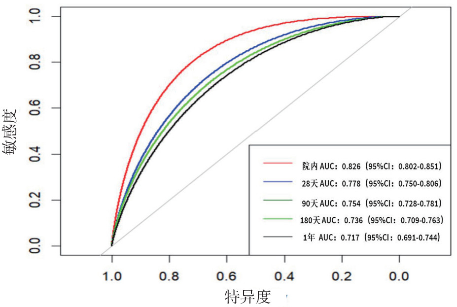 2.3 多因素联合模型与单因素指标预测性能比较多因素联合预测模型与单因素指标在不同时间点的ROC曲线(见图 1),如图 1A所示,本研究所构建的多因素联合预测模型(整合了qSOFA评分、淋巴细胞计数、呼吸机治疗、CRRT及ICU治疗5个指标)在院内、28 d、90 d、180 d及1年五个时间节点的AUC均显著高于单一最佳预测指标ICU治疗(所有时间点DeLong检验P < 0.01)。模型区分度随预测时间延长呈现缓慢衰减趋势(院内AUC: 0.826; 1年AUC: 0.717),表明该模型兼具优异的短期预测效能与稳定的中长期动态风险评估能力。图 1B进一步通过时间依赖性ROC曲线直观呈现了联合模型随时间的动态预测性能,其曲线均位于左上象限,再次验证了模型良好的区分度。
