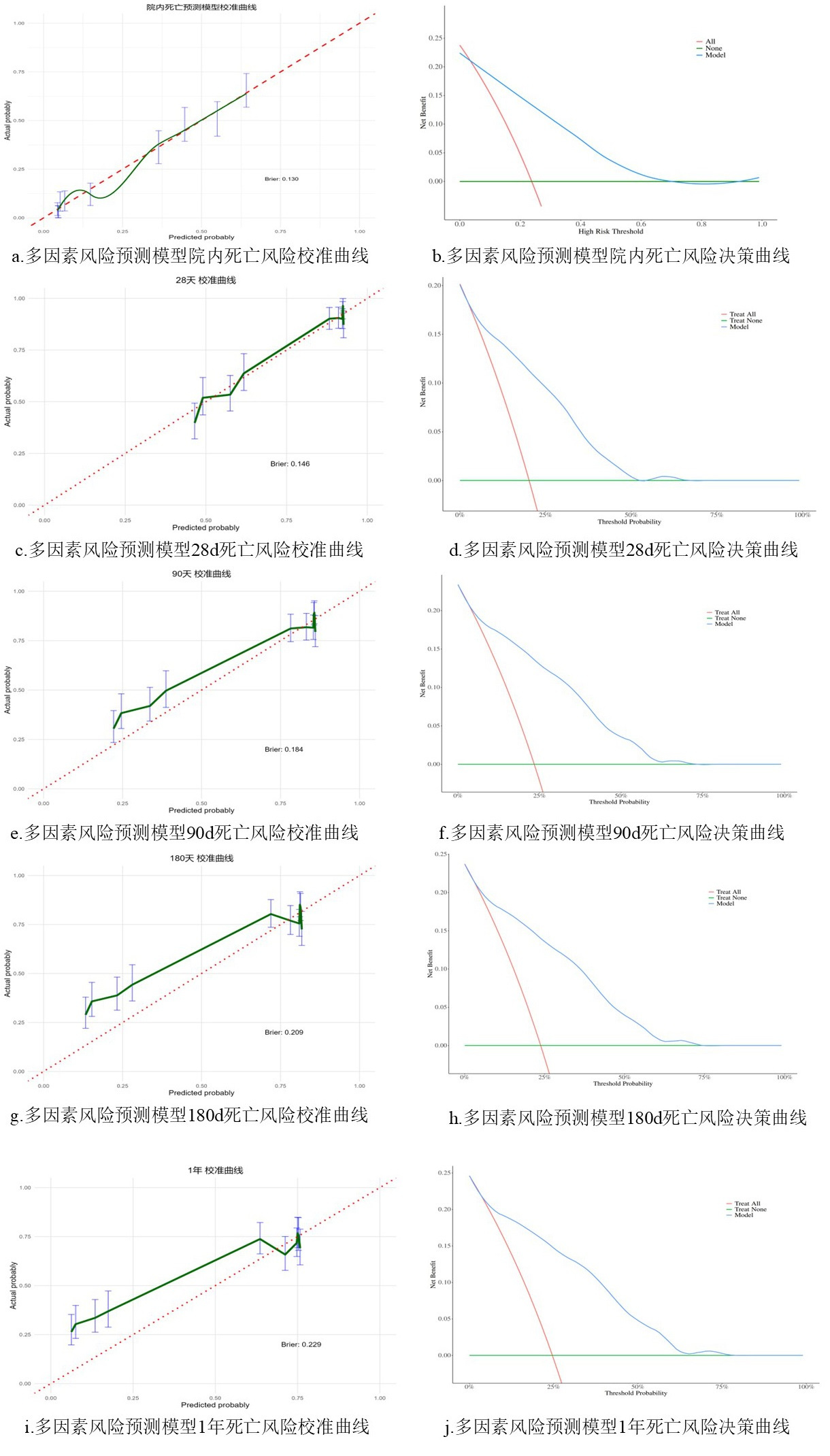 | 注:A:多因素联合预测模型在院内、28 d、90 d、180 d及1年时间点的校准曲线。图中对角线为理想参考线,各时间点曲线均紧贴参考线分布,提示模型预测死亡概率与实际观察概率具有良好的一致性,预测误差较小(各时间点Brier值分别为0.130、0.146、0.184、0.209、0.229)。B:各时间点的决策曲线分析(DCA)。曲线显示,在大多数阈值概率范围内,应用本模型(实线)相比“全部干预”(虚线)或“全不干预”(横轴)策略均能带来更高的临床净获益,表明该模型具有良好的临床实用性和干预指导价值 图 3 多因素联合预测模型在不同时间节点的校准曲线与决策曲线分析(DCA) Fig 3 Calibration curves and decision curve analysis (DCA) of the multivariate prediction model at different time points |