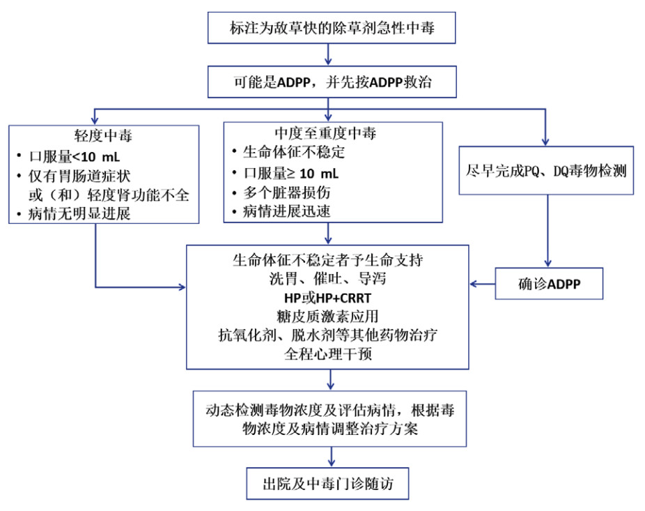3 早期诊断与病情评估根据患者接触史和临床表现,服用标注为敌草快的中毒患者应高度怀疑敌草快混合百草枯中毒,特别是出现与临床特征不相符的肺部损伤或快速进展的多脏器衰竭时。ADPP明确诊断依赖于毒物检测。通过对血液、尿液、胃内容物及残留毒物采用高效液相色谱法、高效液相色谱-质谱联用等方法检测可明确诊断、判断预后及指导治疗。因此,对于疑似联吡啶类除草剂中毒患者,入院后应尽早留取血液或尿液样本检测敌草快、百草枯浓度。需要注意的是,碳酸氢钠/连二亚硫酸盐实验的快速检测可能出现颜色叠加而判读困难,造成漏诊或误判。