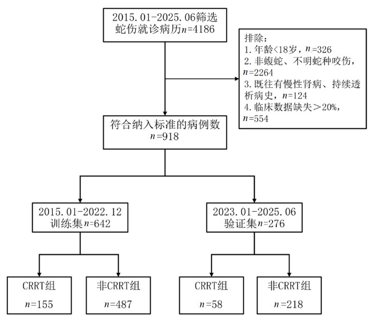 本研究为单中心、回顾性、观察性研究,以解放军中部战区总医院急诊医学科2015年1月至2025年6月收治的蛇咬伤患者作为研究对象。其中2015年1月至2022年12月的数据作为训练集用于模型构建,2023年1月至2025年6月的数据作为验证集集用于测试模型的性能。纳入标准:(1)年龄≥16岁;(2)明确为蝮蛇咬伤的患者;(3)咬伤部位为四肢;(4)对于多次住院的蛇咬伤患者,仅收集首次“蝮蛇咬伤”的就诊数据。排除标准:(1)年龄 < 16岁;(2)其他毒蛇咬伤或不明蛇种咬伤者;(3)既往有血液系统疾病、慢性肾病等;(4)依从性差,未规范注射抗蝮蛇毒血清者;(5)外院已行CRRT治疗者;(6)临床资料数据缺失 > 20%。