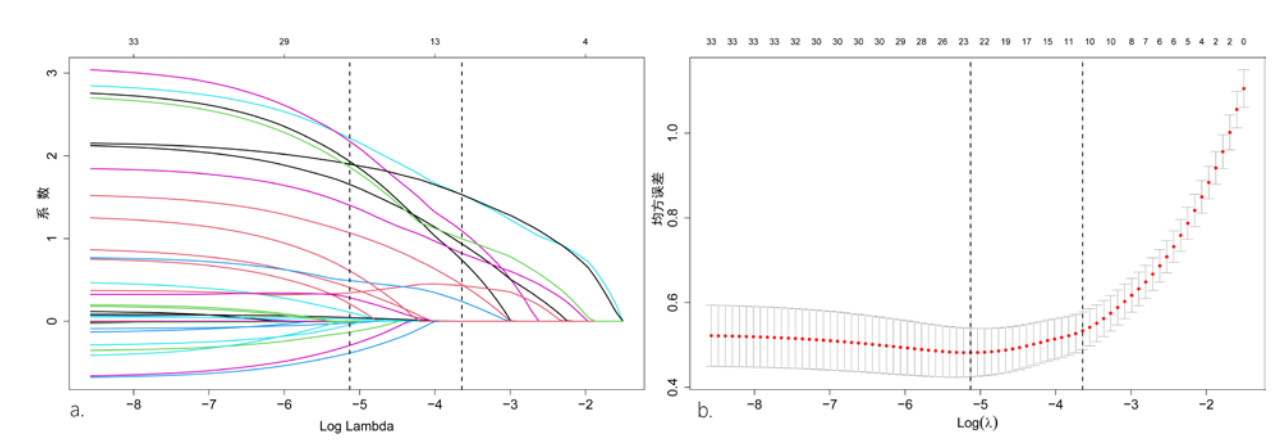 注:a为20个变量的系数曲线,b为筛选最优λ过程 图 2 使用LASSO回归模型筛选预测变量 Fig 2 Selection of predictions of prostate biopsy using the LASSO binary logistic regression model
