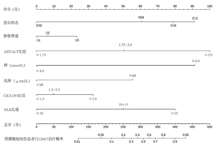 图 3 蝮蛇咬伤患者行CRRT治疗预测模型的列线图 Fig 3 Nomogram of the CRRT Prediction Model for Patients with Gloydius Bites
