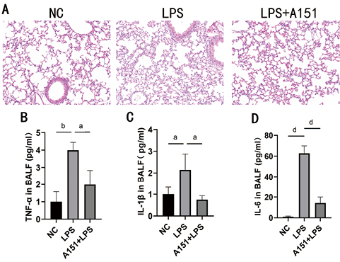 2 结果 2.1 各组小鼠肺组织病理检查结果和肺泡灌洗液炎症因子的变化HE结果显示,NC组肺组织无明显形态学损伤,无明显炎症细胞浸润和肺泡间隔增厚。LPS组肺组织存在明显的形态学损伤,包括炎性细胞浸润和肺泡间隔增厚,而这些损伤在A151+LPS组明显减轻,表现为炎症细胞浸润和肺泡间隔增厚情况减轻。ELISA结果显示,与NC组相比,LPS组TNF-α、IL-1β、IL-6的表达水平显著升高, 差异有统计学意义(均P < 0.05)。与LPS组相比,A151+LPS组TNF-α、IL-1β、IL-6的表达水平降低(P < 0.05,见图 1)。
