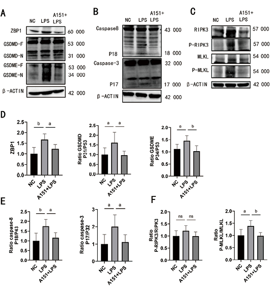 Western Blot检测结果显示,与NC组相比,LPS组小鼠肺组织ZBP1、GSDMD-N、GSDME-N、caspase3 P17、caspase-8 P18、t/p-MLKL表达显著增多意义(均P < 0.05),而t/p-RIPK3蛋白表达差异无统计学意义(P > 0.05)。与LPS组相比,A151+LPS组ZBP1、GSDMD-N、GSDME-N、caspase3 P17、caspase-8 P18、t/p-MLKL表达显著减少(均P < 0.05),但是t/p-RIPK3蛋白表达差异无统计学意义(P > 0.05,见图 2)。