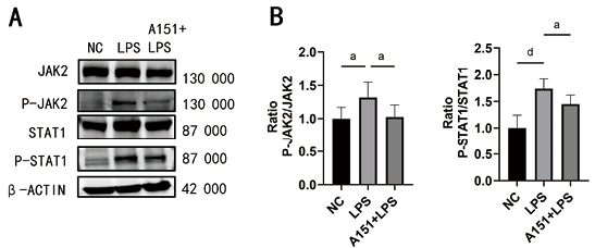 Western Blot检测结果显示,与NC组相比,LPS组p-JAK2、p-STAT1蛋白表达升高(P < 0.01)。与LPS组相比,A151+LPS组p-JAK2、p-STAT1蛋白表达下降(P < 0.05)。见图 3。