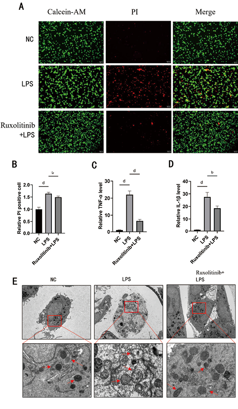 Calcein-AM/PI细胞染色结果显示,与NC组相比,LPS组细胞病死率升高(P < 0.01)。与LPS组相比,Ruxolitinib+LPS组细胞病死率降低(P < 0.01)。RT-qPCR结果显示,与NC组相比,LPS组TNF-α和IL-1β的mRNA表达明显升高(P < 0.01)。而Ruxolitinib+LPS组TNF-α和IL-1β的mRNA表达水平低于LPS组(P < 0.01)。透射电镜结果显示LPS组细胞膜完整性被破坏,细胞质内容物外渗,线粒体肿胀,基质呈现空泡化,嵴断裂消失;Ruxolitinib+LPS组细胞膜完整性较好,线粒体结构虽然完整,但嵴变短,数目减少,排列紊乱,肿胀(见图 4)。