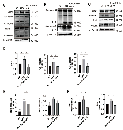 Western Blot结果显示,与NC组相比,LPS组细胞中ZBP1、GSDMD-N、GSDME-N、caspase3 P17、caspase-8 P18、p-RIPK3、p-MLKL的表达增多(均P < 0.05),但t/p-RIPK3差异无统计学意义(P > 0.05)。与LPS组相比,Ruxolitinib+LPS组中ZBP1、GSDMD-N、GSDME-N、caspase3 P17、caspase-8 P18、p-RIPK3、p-MLKL的表达减少(均P < 0.05,见图 5)。