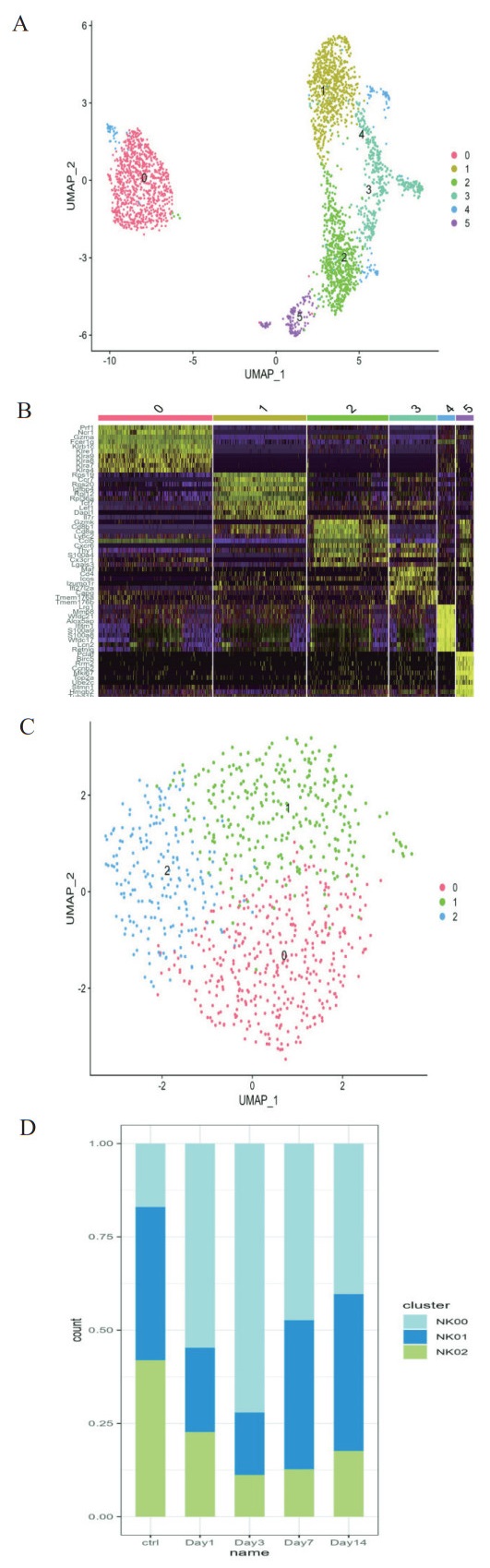 T细胞与NK细胞为机体重要免疫细胞,在清除病原菌、炎症因子释放等方面发挥关键作用。根据聚类分析,可将T细胞与NK细胞分为N0、N1、N2、N2、N3、N4、N5等细胞亚群(图 2A)。N0细胞高表达Gzmb、Gzma、Nkg7、Klrb1c等NK细胞相关分子,表明该群细胞可能为NK细胞(图 2B)。N1细胞高表达CCR7,提示其可能为初始T淋巴细胞,N2高表达CD8a分子,N3高表达CD4分子,可能分别是CD8+、CD4+T淋巴细胞,N4高表达S100A8,S100A9,MMP8等炎症介质,提示其可能为辅助T淋巴细胞(图 2B)。进一步将NK细胞进行聚类分析,共获得NK0、NK1、NK2三大细胞亚群(图 2C)。CLP后NK0细胞百分比逐渐增加,第3天达到高峰;NK1与NK2细胞则逐渐减少,第3天开始逐渐增加(图 2D)。
