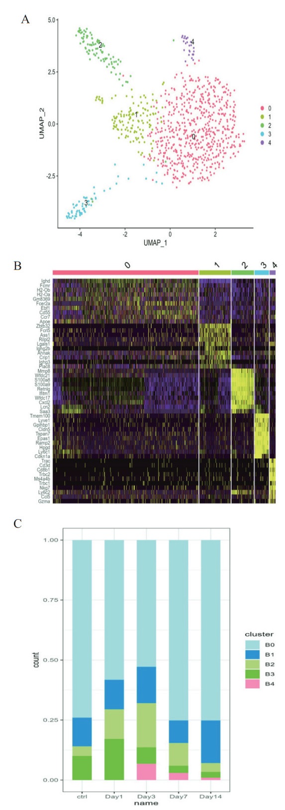B细胞在获得性免疫中发挥重要作用。抗原刺激时,B细胞分化成浆细胞并分泌抗体,执行机体的体液免疫。单细胞测序聚类分析将B细胞分成B0、B1、B2、B3、B4等细胞亚群(图 3A)。B0高表达Ighd,B1高表达Zbtb32,B2高表达Cxcl2,B3高表达Slco2a1,B4高表达Lck等(图 3B)。进一步分析发现CLP 3 d时B4细胞显著增加,第7天时逐渐减少(图 3C)。B0与B3细胞手术后逐渐减少,第7天时逐渐增加(图 3C)。