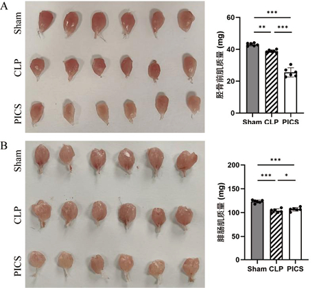 | 注:A为Sham组、CLP组、PIICS组小鼠胫骨前肌的大体照片和湿重;B为Sham组、CLP组、PIICS组小鼠腓肠肌的大体照片和湿重 图 4 Sham、CLP、PⅡCS组小鼠后肢骨骼肌质量的比较(代表性图片,n=6) Fig 4 Comparison of hindlimb skeletal muscle mass among Sham, CLP, and PIICS groups(Representative image, n=6) |
