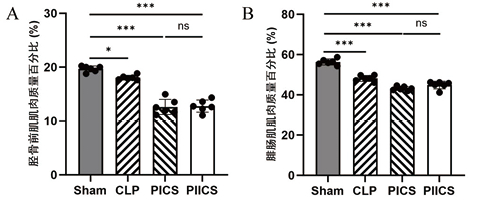 为了校正体重变化对肌肉质量的影响,计算了肌肉湿重与体重的百分比。与Sham组相比,CLP组、PICS组和PIICS组小鼠的胫骨前肌与腓肠肌质量占体重百分比均显著下降(P < 0.05)。相似地,与CLP组相比,PICS组和PIICS组出现了更为严重的肌肉丢失(P < 0.05),而PICS组与PIICS组之间差异无统计学意义(P > 0.05)。见图 5。