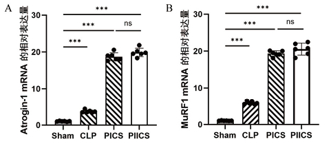 与Sham组相比,CLP组、PICS组和PIICS组小鼠胫骨前肌中促肌肉蛋白降解基因Atrogin-1与Murf1的表达均上调(P < 0.05),且PICS组与PIICS组显著高于CLP组(P < 0.05)。见图 6。