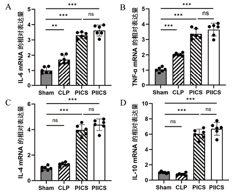 1.3 实验分组及处理按随机数字表法将小鼠分为4组:假手术组(Sham)、CLP组、PICS组、PICS联合LPS二次打击组(PIICS),每组10只。CLP组是通过盲肠结扎穿孔的外科手术诱发,先对小鼠进行异氟烷吸入麻醉(诱导3%,维持1.5%~2%),并做一个小的中线腹部切口。然后将盲肠外化,盲肠远端的33%用5-0丝结扎,用21 G针头刺穿结扎的盲肠一次,从穿孔轻轻挤出少量粪便,确保穿刺通畅。然后将盲肠重新纳入腹腔,并闭合切口。在Sham组中,开腹后仅游离盲肠,不进行结扎与穿孔,其余步骤与CLP组相同。所有小鼠在CLP术后接受1 mL无菌PBS进行液体复苏。在PICS组中,在CLP术后,不予以任何干预,持续观察至第8天,处死小鼠,用于模拟PICS状态。在PIICS组中,在CLP术后第11天,对存活小鼠腹腔注射1 mg/kg LPS[12],以模拟二次打击,并持续观察至第14天,处死小鼠。实验终点时,先采用异氟烷深度麻醉小鼠至无知觉状态,确认麻醉深度后实施颈椎脱臼法处死。
