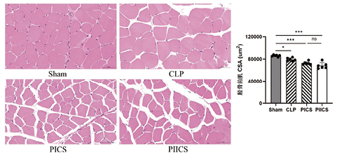 通过HE染色,观察了各组小鼠胫骨前肌的组织形态学变化。Sham组小鼠胫骨前肌肌纤维排列整齐、形态规则,CLP组、PICS组及PIICS组则可见肌纤维横截面积减小、间隙增宽,伴炎性细胞浸润,提示肌肉组织发生明显萎缩与炎症改变。