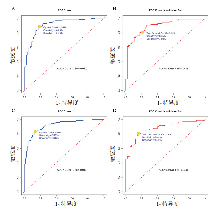 | 注:A:min模型训练集;B:min模型验证集;C:1se模型训练集;D:1se模型验证集;Optimal Cutoff为最佳截断值,Sensitivity为敏感度, Specificity为特异度 图 3 预测模型的ROC曲线 Fig 3 ROC curves of the prediction model |