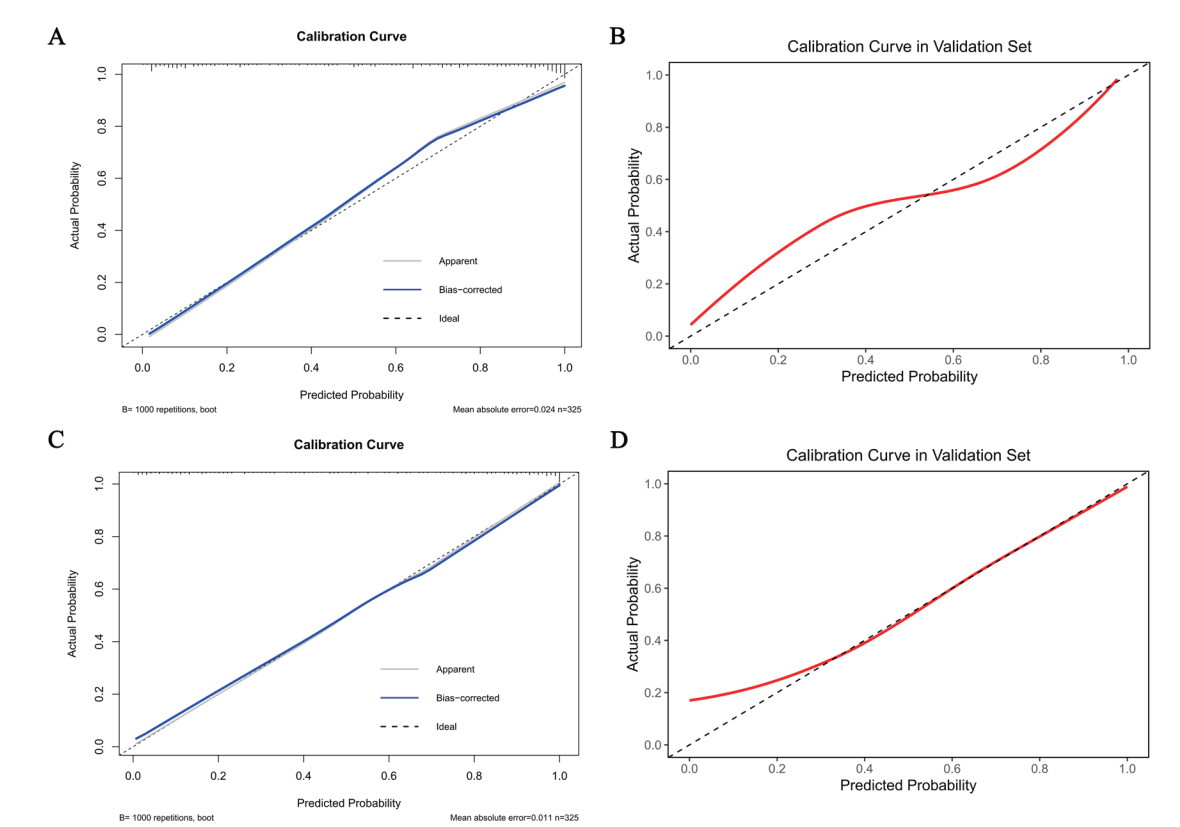 | 注:A为min模型训练集;B为min模型验证集;C为1se模型训练集;D为1se模型验证集;纵轴表示实际概率,横轴表示预测概率 图 4 预测模型的校准曲线 Fig 4 Calibration curves of the prediction model |